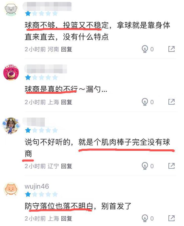 本轮上海主场95-78力克广州的比赛,刘礼嘉首发出战13分钟,3投1中,仅得到2分2篮板,正负值是全队最低的-9。要知道,这场比赛上海可是赢了对手17分,看着刘礼嘉在场上好像不知所措的样子,球迷直言:球商是真的不行……